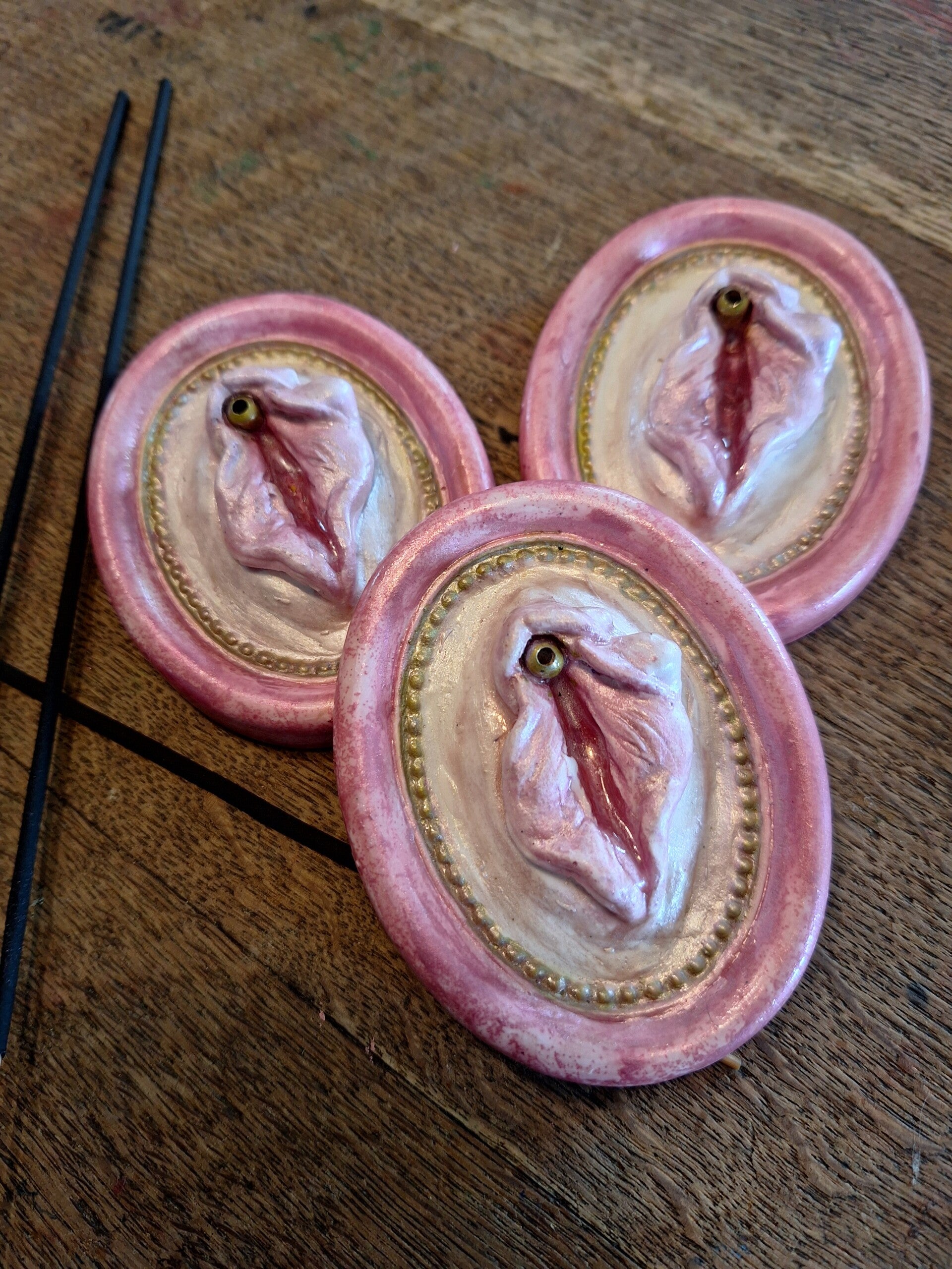 Handgemaakte wierrook houder in de vorm van een vulva.