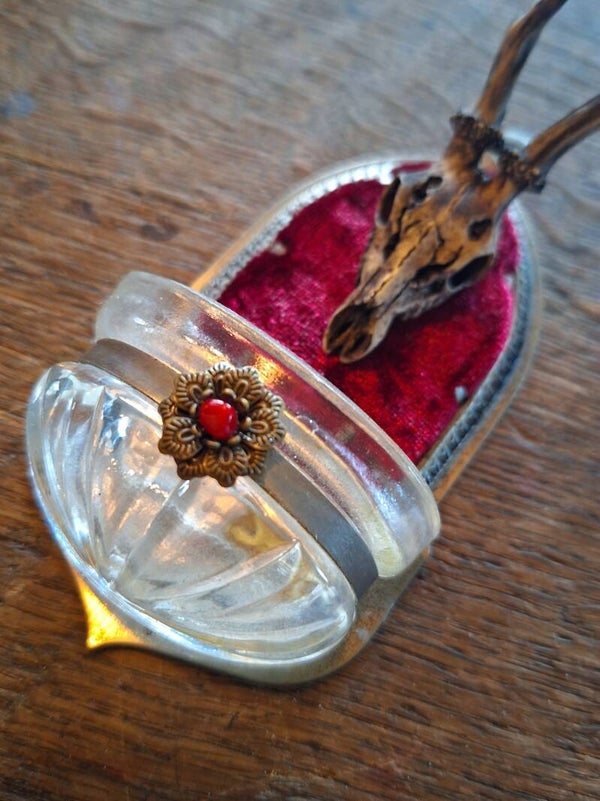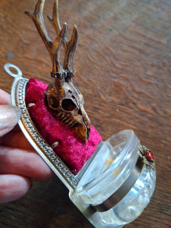 Versierd met wijnrood velours, een gedetailleerde hertenschedel van resin (handbeschilderd) en een filigraan bloemetje met steentje.