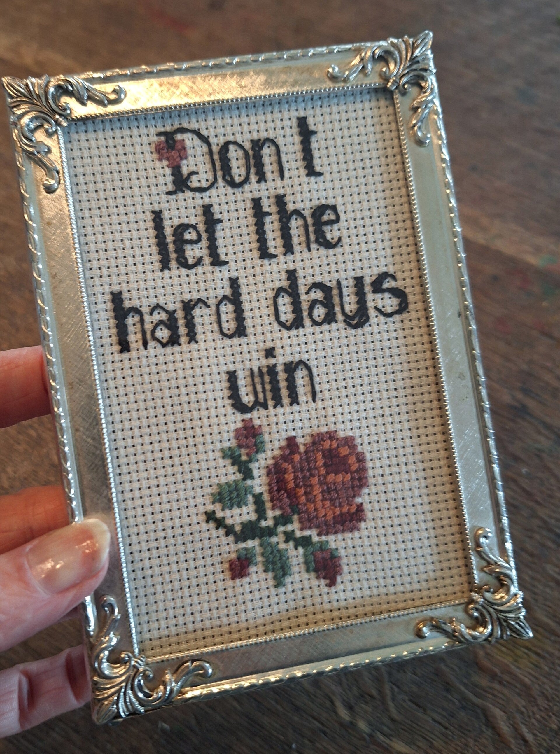 Handgeborduurd.