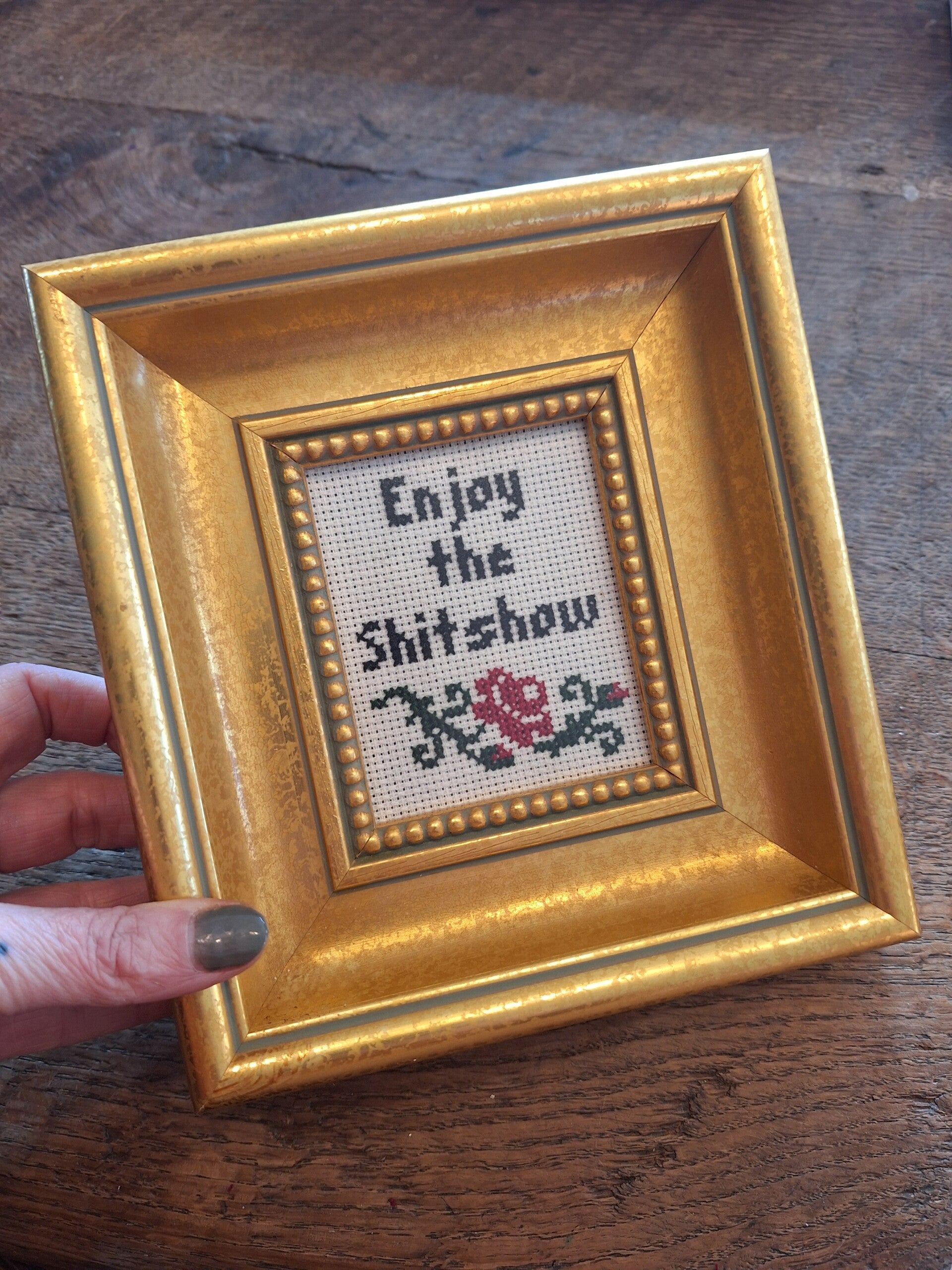 Dikke sierlijst van hout, met haakje om op te hangen.